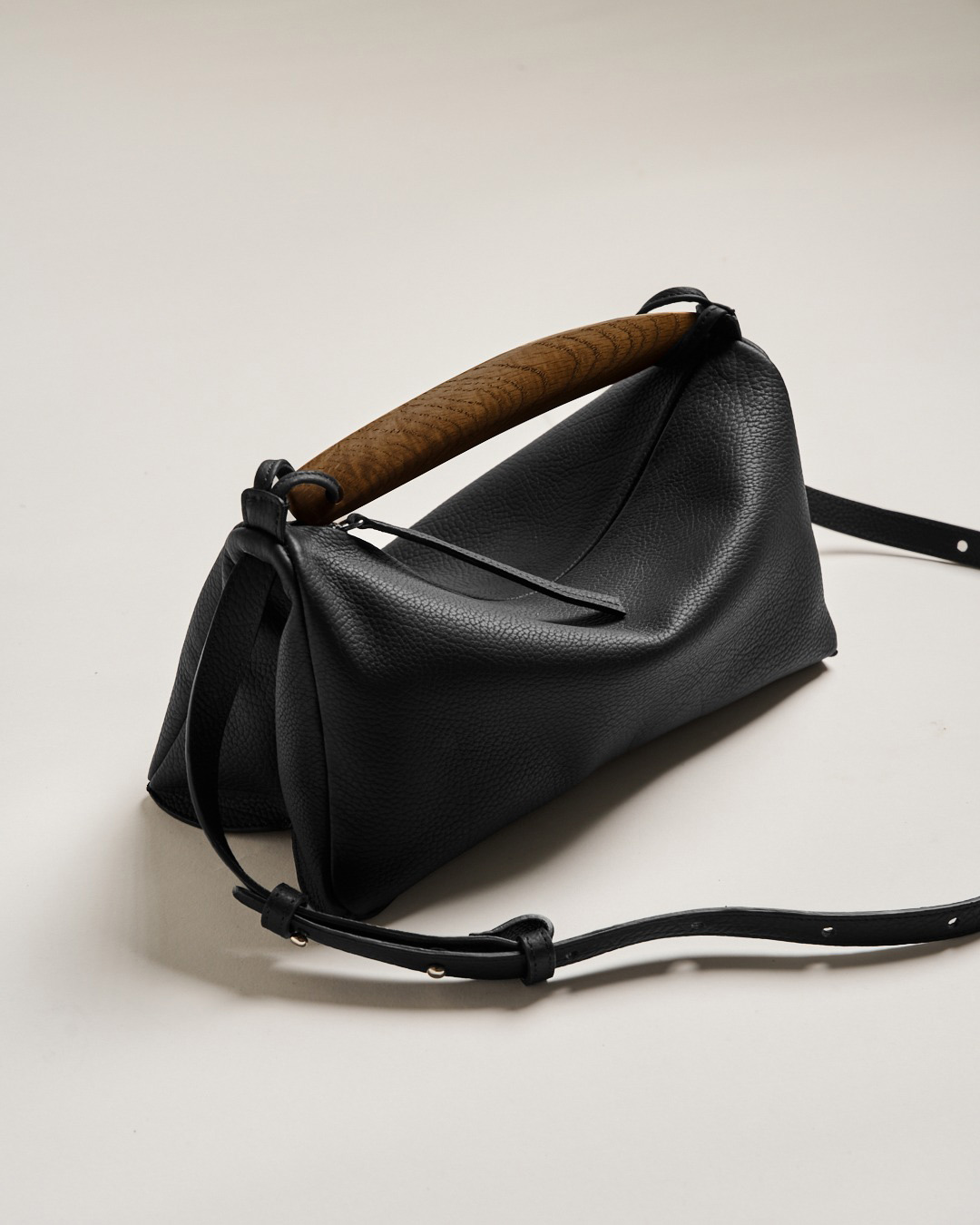 The handle by Van Put is made from Afromosia wood, reclaimed from a residential project. Its distinctive shape is inspired by the long, slender form of a razor clam, also known as Ensis, which he often encounters during walks along the northern French coastline. The bag is constructed by joining two leather halves that—like the two parts of a shell—form a whole. The wooden element subtly pulls the ends together, creating an elegant fold in the leather.