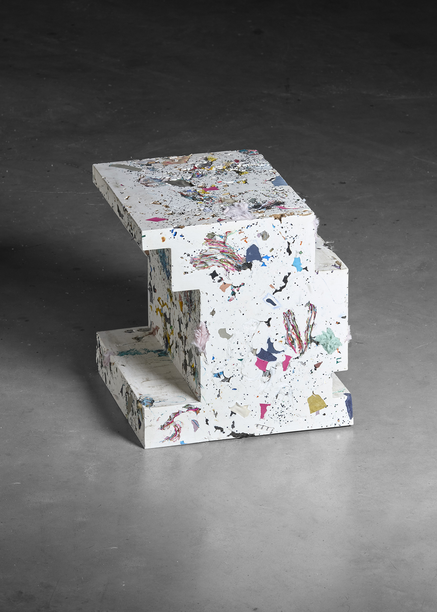 Zaventem Ateliers donates a Blend stool, made up of thousands of waste fragments—production residues from all the workshops at Zaventem Ateliers. The scraps from each workshop are meticulously crushed, mixed, and bound together. This process creates, not in form but in composition, a hazardous and entirely unique stool. The piece brings together extraordinary fragments from all workshops: leather, brass, glass, ceramics, resin, foam, glitter, wood, and more. Each workshop carefully preserves its waste, which is then shredded with the help of the RENEWI company.